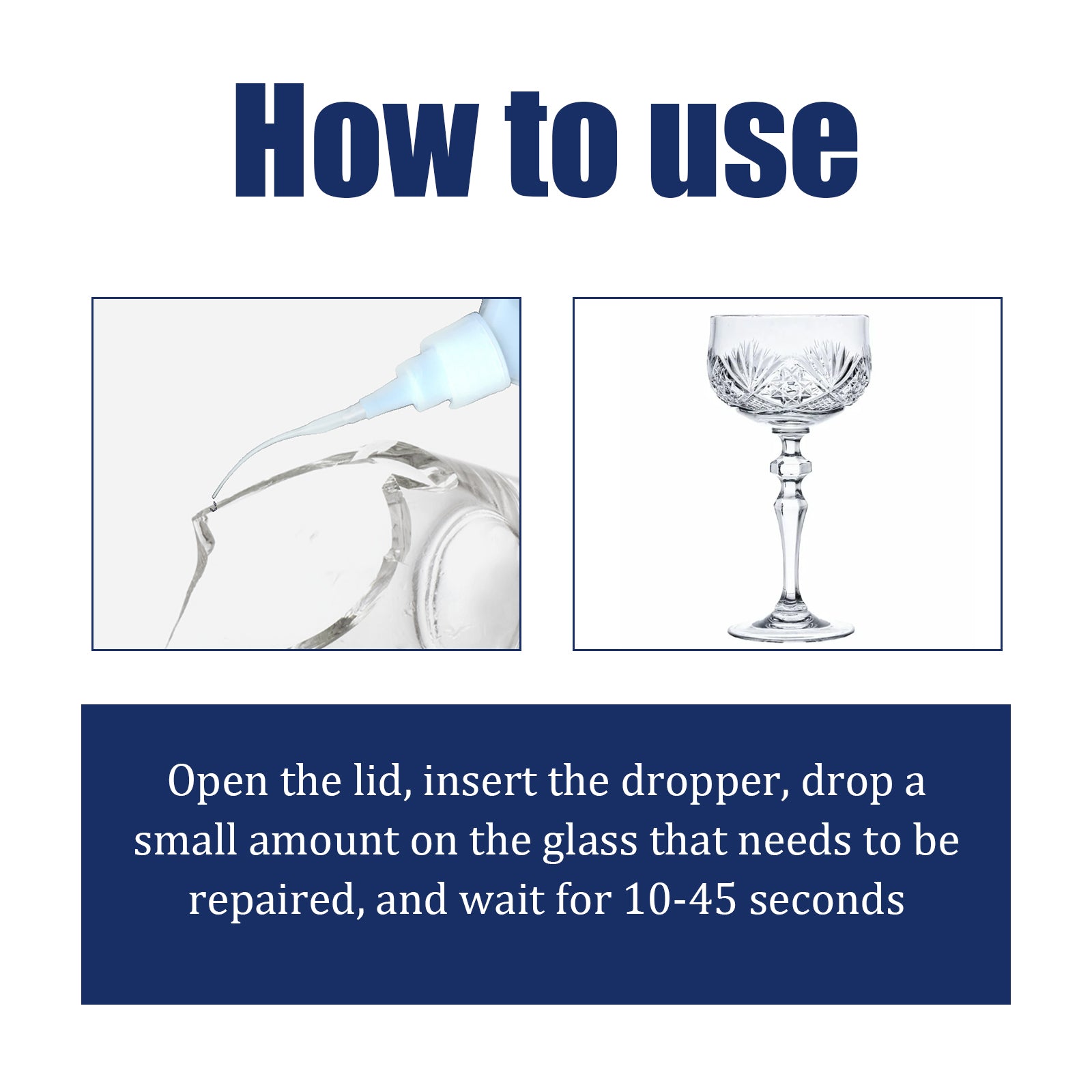Our Glass Glue contain acrylic fibers, epoxy resins and solvents. It can always remain sticky, making the glass more stable and beautiful. Its use is very simple: open the lid, insert the dropper, drop a small amount on the glass that needs to be repaired, and wait 10 to 45 seconds. It can quickly repair the glass products and restore the original beauty of the glass.